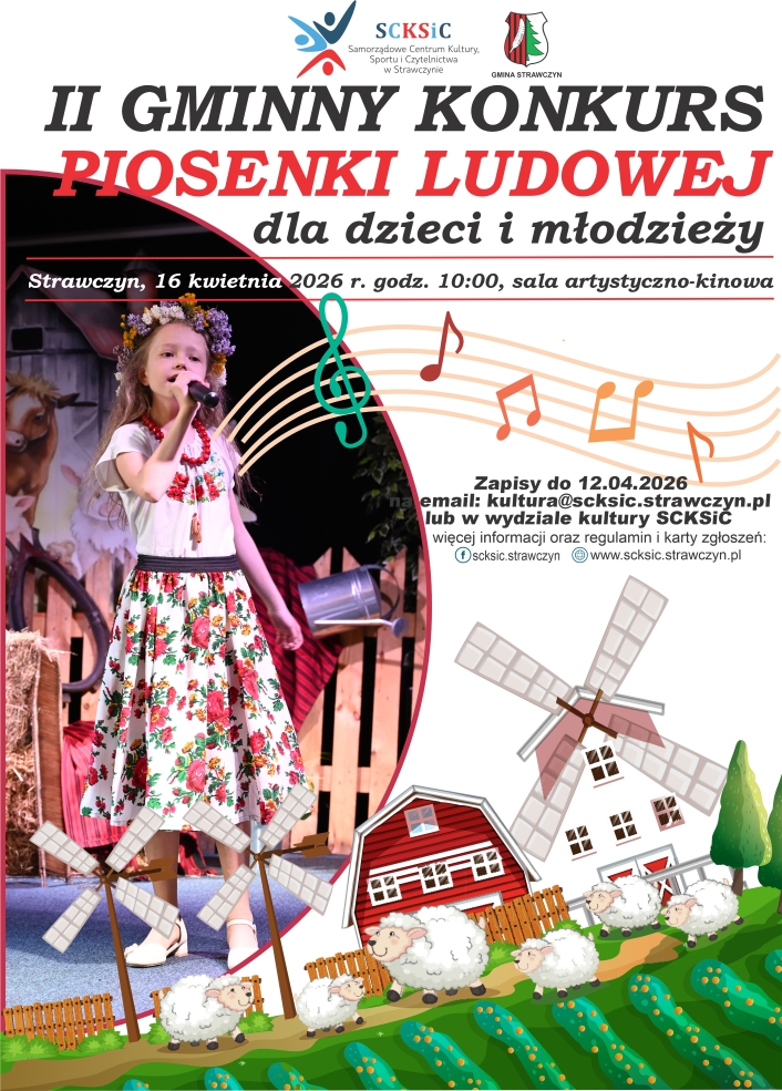 Samorządowe Centrum Kultury, Sportu i Czytelnictwa w Strawczynie serdecznie zaprasza do wzięcia udziału w II Gminnym Konkursie Piosenki Ludowej - Strawczyn 2026